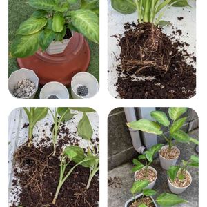 庭仕事の前に まずは植え替え ディフェンバキアちゃん 何とか夏を過ごしましたが葉っぱが黄色くなってます 付箋付 🟨 観葉多年草 サトイモ科 ディフェンバキア属 原産 熱帯アメリカ 10〜200cm ※樹液に注意 (シュウ酸カルシウム) 寒さに弱く 暑さに強い 花は白!! 直射日光✖ エアコン✖ 半日陰 成長が早いので1〜2年で植え替え 土 : 赤玉土 鹿沼土 パーライト(透水性水はけに優れる) 📝 大きくしたいのに小さくなってしまいました 😅😰