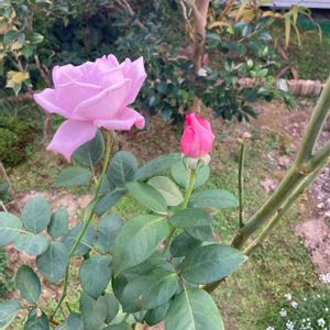 ブルームーン(薔薇)が咲きました。蕾(右)は濃いピンクですが、開花すると(左)はブルーになります。今日久留米の石橋文化センターに行ったらブルームーンが50本ほど植えられていて開花してました。とても迫力があり綺麗でしたが、オンリーワンは庭のブルームーンです。