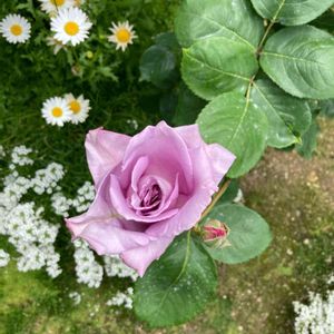 本日2回目の投稿です💦 開花5番手はブルームーン。 昨年980円の新苗でお迎えしました。鉢で育てている間は樹形のバランスが悪くて、風で煽られてよく倒れていましたが、地植えにしたらいい感じに立派に育ちました。 カップ咲きが多い我が家の中で『ザ・薔薇』の花形です。 藤色がステキです💕