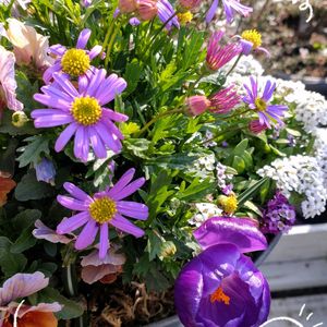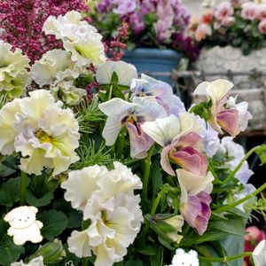 彩りが 無くなった冬の終わり口 庭に 足したお花 紅白🔴⬜️の金魚草 チューリップ🌷球根仕込み 2枚目以降のビオラとストックの小苗寄せ植えは農園の方が譲ってくれたもの、百円苗の組み合わせです✨
