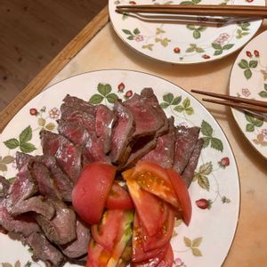 夕食です。 ここ数年は、夕飯は食べない生活です。 しかし今日は、珍しく食べる事に。 だって、パンとローストビーフがあるんですもん。 ローストビーフ握り寿司 塩発酵バターパン ローストビーフ 玉葱、茹で卵、マヨネーズサラダ トマト🍅 オニオンポテトスープ
