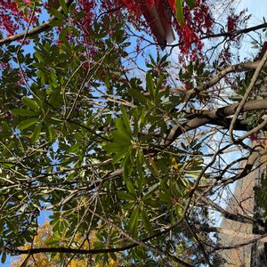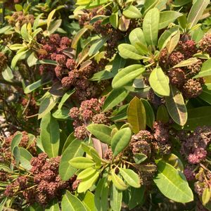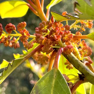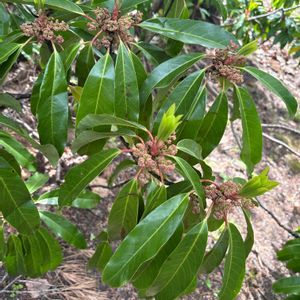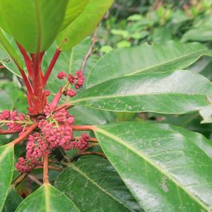 先日の登山で❗ ユズリハの雄花は、花弁はなく多数の雄しべがつきます! 枝先に かたまってつき、葯が赤紫色をしているので、よく目立ちます。!