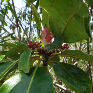 ユズリハ(楪) ユズリハ科ユズリハ属 常緑高木 春に新しい葉が出ると古い葉が場所を譲るように落ちて生え替わるようすが特に目立つことが特徴で、和名の由来になっている。 2月2日 場所:新城市 五葉山