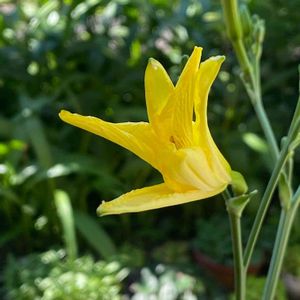 あ"ー咲いてたのね💦 昨日、帰宅したときには全く気がつきませんでした。今朝、庭に出たら閉じかけたユウスゲちゃんがいました。しかもこっちを向いて😥 たった一晩の花です。儚い…