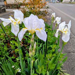 道路の植え込み 他所よりも早くジャーマンアイリスが咲いていました🤍✨ 下の方にはオオアマナも😊