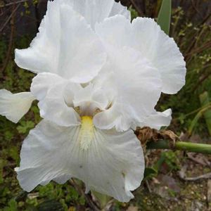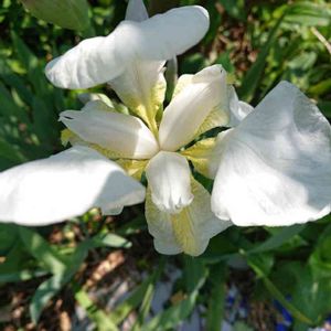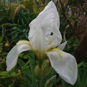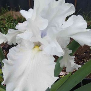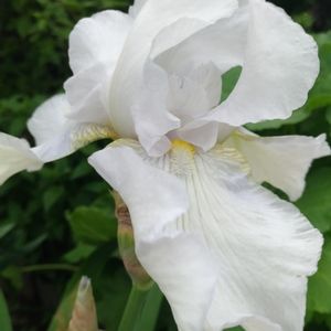 🌸ジャーマンアイリス🌸 (手前には次の蕾があります) 広い葉と花弁の黄色いヒゲ! 白のジャーマンアイリスではないですか? 豪華な色のが多い中、 白いのはシンプルですよねー! ニオイイリスと言う名前があるようです。