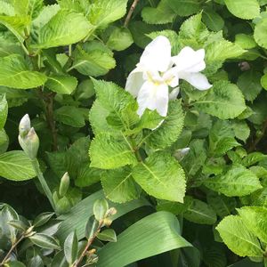 アジサイの葉の間からジャーマンアイリスの白花❣️