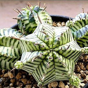 トウダイグサ科 ユーフォルビア属 メロフォルミス 斑入り。😸😸 我が家にお迎えしてからパッと見、何の変化も見せないメロフォルミスちゃん。🤔 でも、とりあえず元気みたいだからいいっか。(笑)😋 正面アングルから撮影してみました。😀
