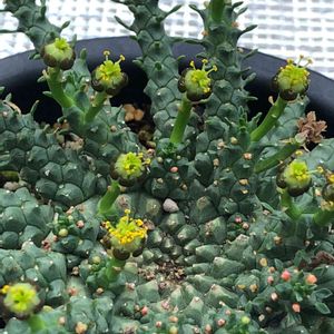 【ユーフォルビア ゴットレベイ or ゴットレッベイ】 家族になって初咲き🌸(*゚▽゚ノノ゙☆パチパチ ゴツゴツ➕もじゃっとフォルムで男前なのに、なんとかわいいお花(´∀`,,人)✨❤️*. ギャップがイイですネッ👍