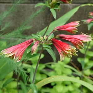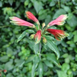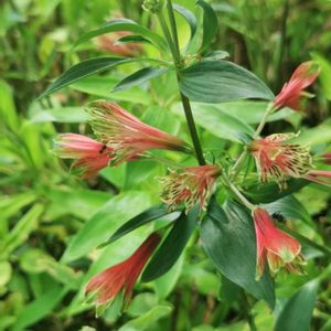 【アルストロメリア・プルケラ 】 ブラジル原産、ユリズイセン科多年草 エキゾチックな赤と緑のコントラストが魅力の原種のアルストロメリア。 5-7月に茎頂に散形花序をだし、長さ3-5cmの赤色の筒状の花を3-9個つける。花被片は赤、紫褐色の斑点があり、頂部は緑色。 草丈:40~50cm 開花期:5月~7月 花色:赤・緑 近所の空き地にて