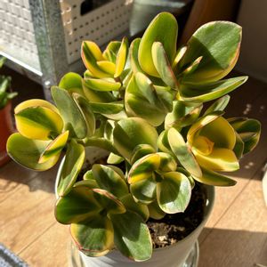 一目惚れした 斑入りの金のなる木を お迎えした!! ノーマル緑の金のなる木は昔から育ててすごく増えやすい。 この子の白と緑と葉っぱの縁が赤いバランスが気に入りました。