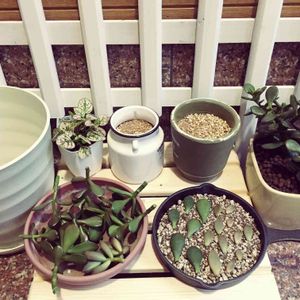 いつも植え替えは玄関でしています。 座って出来るので楽ちんです。 生長してグラグラになった黄金花月をカットして植え替えます。 ついでに挿し木と葉挿しで増やせたら良いなぁ。 葉挿しはスキレットに並べてみました。