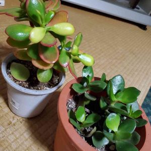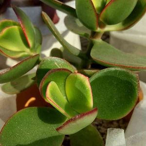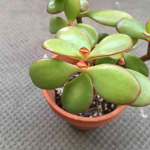 黄金花月(金の成る木)。。。 もらった?葉っぱを土の上に置いて、1ヶ月半位かな?根が出て、可愛い赤い葉が顔を出しました\(♡*∀*♡)/♥️