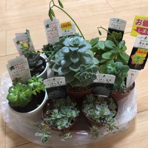 ホーマックデポで多肉用の棚を見に行ったら 取り扱ってませんと言われ 多肉ちゃんコーナーを覗いたら お値打ち価格が何点かあり 我が家にもある薄化粧が¥100 薄氷¥328←3号鉢 子吹が数箇所 我が家にない子持ち蓮華 × 2鉢 ゴルビュー × 1鉢 エメラルドグリーン × 1鉢 大和錦 × 1鉢 レティジア × 1鉢 エメラルドグリーンと大和錦とゴルビューには 花芽があり エメラルドグリーンには 可愛い黄色の花が咲いてます❤︎*。 子持ち蓮華はモリモリにしたいから 大きな鉢に植え替えする予定だけど これで大丈夫なんですか? 雨ざらしにしても大丈夫みたいな事を とある子持ち蓮華の出品者様が言ってましたが 大丈夫なのか、先輩方コメントお待ちしてます🙏