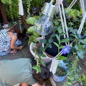 マクラメハンガープランツにした、つる日々草の花が咲いてました🤗季節外れの花で可愛いです❤️ 先日、孫達が平板の隙間に生えている 雑草取りをしてくれてます😊 小さな草取りグッズを貸すと競って取ってくれました。 お願いしていないのに、やりたーいって言うので いい子に育って嬉しいです☺️💕
