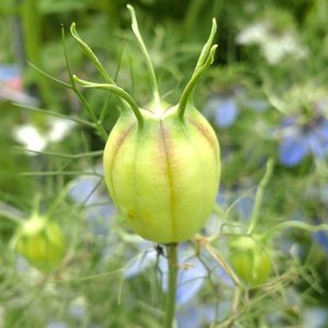🟢ニゲラの実🟢 目👀・鼻・口👄書いたら宇宙人👽の頭に似ていないですか? 面白い🟢実ですよね! この中に種もできるのでしょうね! 去年は天候悪く成長が頗る良くなかったので、この様な🟢実にならなかったのを覚えています! 2025.5.19.📸pic