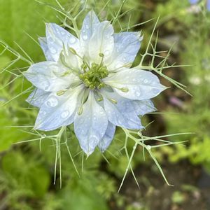 ニゲラ🩵🤍🩵 雨に濡れて。 取っておいた種をパラパラッと蒔いておいたら予想以上に咲きました。 花壇の外にまで😳こんなとこに蒔いてないのに〜 すごいパワー👍