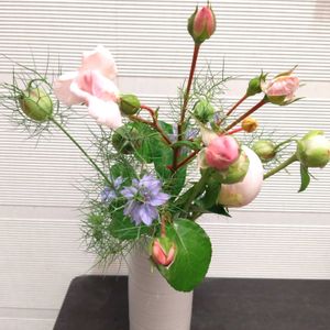 おはようございます😊 今日も明日も☔予報が出てたのに、いつの間にか消えちゃいました😅 水やりしないと…😓 庭で咲いているお花をカットして、ミニアレンジしてみました🌸💟💮❇️ 花びらが散ったニゲラも面白いので入れてみました🎶 つるバラも芍薬もまだ蕾だからちょっと淋しい感じですが、開花を楽しみに待ちます🤗
