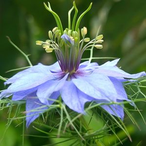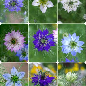 《ニゲラ》 白や青、紫紅色の花弁のように見える部分は萼片で、苞と呼ばれる糸状の葉が花を包むように覆っています🤭🌸 本当の花弁は退化していて目立ちませんが、八重咲きの品種では花弁が萼片のように発達しています🌸