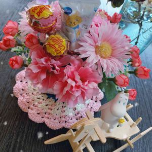 🌸フラワーアレンジメント🌸 アーティフィシャルフラワー(造花) 優しいピンク系のお花 ガーベラやカーネーションをうまい棒や飴ちゃんとアレンジしてみましたよ🤗 姪の子供(5歳)にバレンタインのプレゼント🎁を贈ります。 喜んでくれるかな😋😋🍀 これも全て100均です😊 植物が喜ぶ暖かな陽射しが何よりも 嬉しく感じます😍 今日も笑顔の一日を🍀