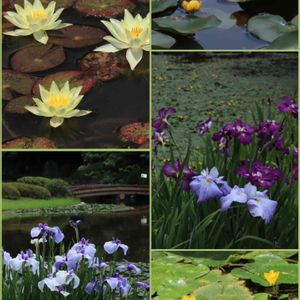 二の丸池のお花たち ↖️ヒツジグサ ↙️➡️花菖蒲 ↗️コウホネ…御所の池から株を移したもの ↘️アサザ…赤坂御用地の池から移したもの
