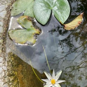 ヒツジグサ 未草 スイレン科 睡蓮の中で唯一在来種なんだそうです❤️ 小さくて白い花がとても素敵です💚💚💕 綺麗な水ですが、曇り空が映りなんだか水が淀んで見えてます💙
