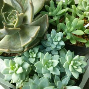 こんばんは~☺️ 今日は7月月末…早いものですね~😚 今月初めにお迎えしていた ☘️セダムとエケベリアさん☘️ 微妙に違う緑色が大好きです💚 元気なうちに…今月中に…植え替えを… と思っていましたが💦まだポットのまま😓 ここ2・3日…夕方になると 激しい雷雨⚡️🌧️が続いたせいか? 意外に元気にしてくれています😊 はいっ🖐️早く植え替えしま~す😅