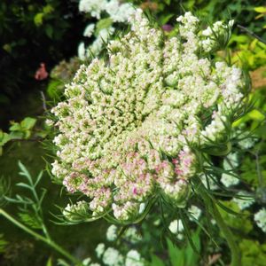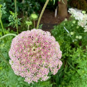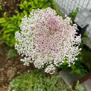 白いお花とタワシ、、、じゃなくて💦 どちらもダウカス・ダラ。チベットの高僧みたいな名前。 これ、人参らしいです🥕一株だけですごいボリューム‼️ 5/28にお見せしたレースフラワーとも言うらしいんだけど。ってコメントつけたお花です。 苗についてた札にはレースフラワーとは書いてないし、調べてもレースフラワーって言ってもいいけどね。みたいな感じで、なんか違うっぽい。 人参なんだって最近知りました。 掘ったら太い人参出てくるかな? 1ヶ月前に大きなレースフラワーのように咲いていたところがタワシになり、今咲いてる花は、以前の1/4位の大きさです。 随分見た目が変わりましたが、今の姿を楽しんでいます。