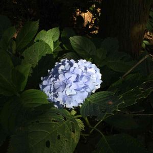 山に咲くアジサイ。木々の合間から差し込む光に照らされて。