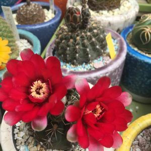 連日サボテンの花が咲いてくれてます 今日は緋花玉の花が咲きました 2つ同時に開いてくれたのでとても華やかです 透明感のある赤い花で 午後から開き始めて夕方には閉じてしまいました とても大きくて美しい花でした 明日も開いてくれるかな?