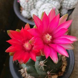 サボテン ギムノカリキウム 緋花玉2号 気温少し上がってやっと開きました。😊 奥の1号はまた蕾膨らんでます。