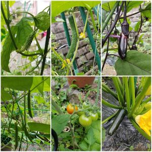 畑の作物です。 左上:モロッコインゲン。 小さな実をつけ始めました。 中 :上は、スイートバジル。 プックリと育っています。 下がルッコラ。 生命力旺盛でワサワサ育っていま す。 右上:ミニトマト。 赤く色づき始めました。 右下:シシトウ。 実が育ってきました。 左下:長ナス。 34cmもありました。 今回は、ルッコラ、ミニトマト、シシトウ、長ナスを収穫しました。 ルッコラは、パスタ、挽き肉と炒めてご飯にのせたり、漬物風にしてかなり消費しました。 ルッコラは、鉄分、カリウム、カルシウムがあるそうです。 身体に良さそうです。 長ナスは油で焼いて三升漬けで食べてみると、トロトロで美味しかったです。 畑作業は疲れるのですが、収穫した野菜の美味しさは、格別です。