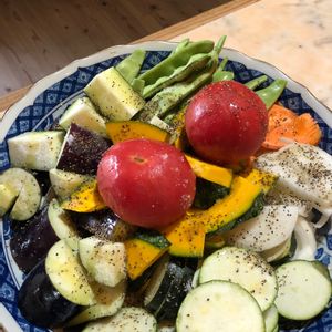 ラタトゥユ ズッキーニ、カボチャ、ナス、モロッコインゲン、トマト、人参、玉ねぎを、適宜カット、トマトは、丸のまま。 30センチの大鉢に。 塩、オリーブオイルを回し掛け粗挽き黒胡椒をかける。 皿を覆うポリ袋に入れて、10分、少し野菜を動かし更に10分、火通りを確かめ更に5分前後レンチン。 トマトの皮を取り除く。 水は、入れて居ないが、野菜から、かなりのスープが出て居ます。