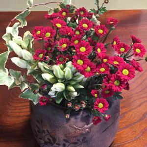 仏壇にお供えした仏花を下げ、 小火鉢に小さくアレンジメントしてみました。
