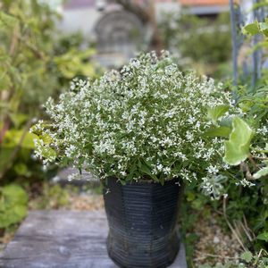 花はホワイトだけの寄植え❣️ 白い花は夏は涼しげ ということで花は白いものだけにしました。 ニチニチソウ、アンゲロニア、ユーフォルビア フロスト? ニチニチソウは渇き気味の方が調子が良いみたいです。葉っぱが丸まってくるのを水遣りサインにしてます😆