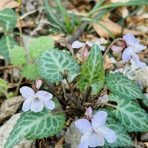 フイリヒナスミレ(斑入雛菫) 分布: 北海道南部から本州、四国、九州中部以北の主に太平洋側山地に生育 ・ヒナスミレの品種で、葉脈に沿っ てハッキリとした白い斑が入るの が特徴 ・側弁には少量の毛が見られる ・花や生育環境はヒナスミレとほぼ 同じで、ヒナスミレとは場所をわ けて咲いていました。 2025/3/28