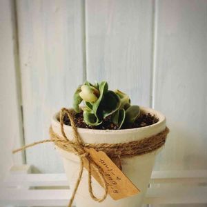 素焼き鉢、白バージョンも😊 同じく、麻紐で巻いて名札タグ🏷を🙌🏻 まだ小さいですが ホヤを植えました🌱