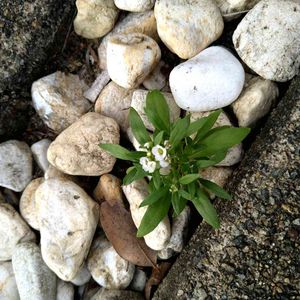ど根性アリッサム😆 駐車場のスリットに敷いた石の間から😯