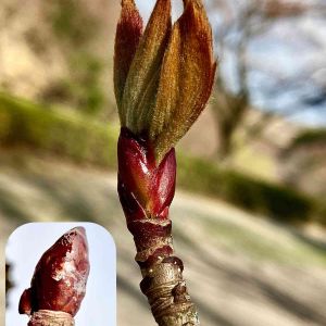 新芽シリーズ❶ トチ(栃)の木の新芽 水飴を塗ったような芽鱗の冬芽から、 ついに柔らかな新芽を見せてくれました! 宮城県白石市 材木岩
