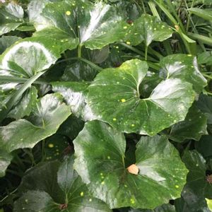 ツワブキ 星斑 キク科ツワブキ属。 原産地 日本 朝鮮南部 中国東部〜南部、台湾。 ツワブキの栽培品種100種ほどあると、 蛍がいるみたい。