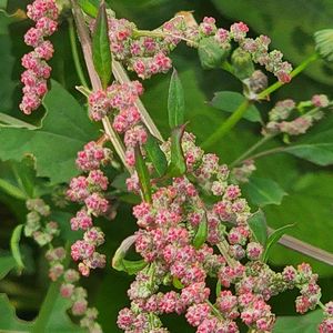 のんびり里山散歩🚶♀️… モコモコついたお花が重く 垂れ下がってユラユラ〰︎ お花を見たのは初めてです!(*⁰▿⁰*) 「アカザ」赤麻、藜 アカザ科(ヒユ科) 地方名・アカジャ、センべグサ 薬用植物ですが、花粉が飛散しやすく アレルギーの原因になっています🤧 🏷木曜モフモフ