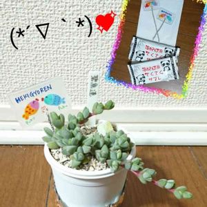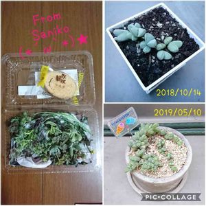 今日はトトの日🐟🐟🐟先月植え替えた、碧魚連🍀✨久々のbefore afterです😉💡お迎えした当初と現在…何という事でしょう(*´ω`*)💖素晴らしい成長ぶり😂💮こんなにもりもりになるなんて、想像もつかなかったよ😌🎵前の鉢でははみ出てたから、長いとこをちょんぱして真ん中にサクッと挿す🌱✨仕上げにタイヨウさんからのピック添えて😁👌こちらの増え具合もこれから期待したいな😉👍 そして一昨日、不在票が入ってたので受け取りが昨日になった、サニコさんからのステキ便🙌💚手紙にどこに何が入っているかが記載してあって、ものの見事に全部持ってない多肉さんばかり😲💡お店で見るとそんなに気にならなかった多肉さんも、こうして手元で見ると新たな魅力を発見しちゃう😆💓ますます多肉さん好きになるわー(*´∇`人)💝 サニコさんこの度は本当にありがとうございました🤗❤️用事のない休みに、頑張って寄せてみます🙆🌼
