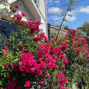 今日フェンスの薔薇🌹ニ枚目です😅 この赤いツルバラも満開になったので🎶 青空の下で綺麗です 車が傷つかないように新芽が伸びた所 カットします
