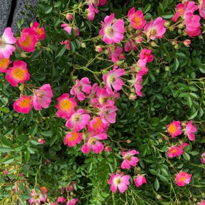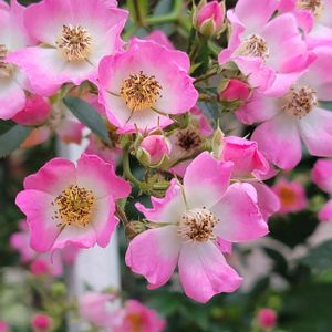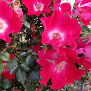 ツルバラ ❤️⚪️❤️ カクテル(コクテール) 別名:クライミング・ローズ 🔹一重の平咲きで微香 🔹緋色に中心が薄い黄色や白の華やかな色彩です😌💓 🔹花付きが素晴らしく見事!(ご近所さんの~😂) 花言葉:「無邪気」「爽やか」…