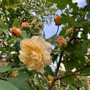 2年ほど前に知人から頂いたツルバラ? 花瓶に挿しておいたのを鉢に挿し木、その後地植えに。 やっと咲きました❗ 真っ白いお花🌷 チェリーセージの間からつぼみが顔を出してます☺️ 名前あるのかな? ナニワイバラと教えて頂きました(*´˘`*)🙇✨