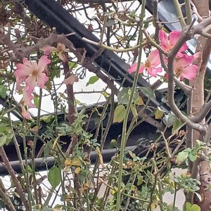 いつもカーポートの上に咲いているご近所のツルバラ🌹高過ぎて写真に撮れなかったのに、カーポートの中で咲いていました❗嬉しくてパチリ📱