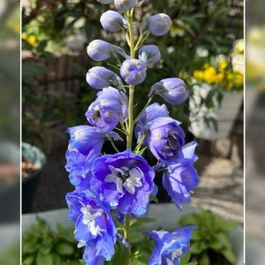 2021年4月6日撮影 デルフィニウムが見事に咲きました! 昨年秋にタキイ種苗のオーロラの苗を植えつけましたが、置き場所が屋根のある陽だまりだったため、プランターにもかかわらず立派に成長しました。 バラと一緒に咲く予定でしたが、あまりに早い開花でした…😅