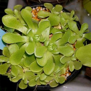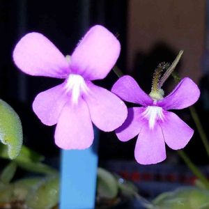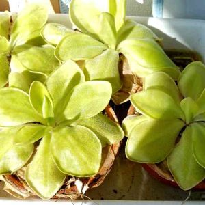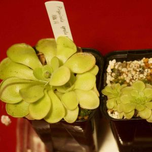 左がPinguicula agnata × rotundiflora (朧月)、右がPinguicula rotundiflora ウチの朧月はまだ夏葉で、P. rotundifloraを大きくしたような感じ。 窓辺は最近冷え込んできて10℃以下まで下がっています。
