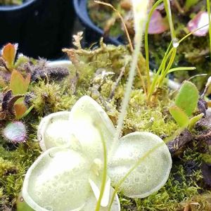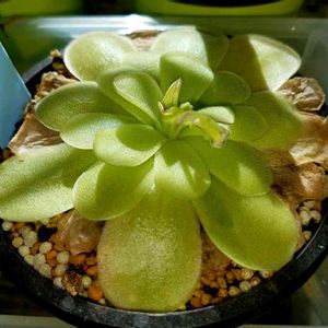 母親に贈って現在代行管理中のP.エセリアナ(やまはる園芸さんより購入)です。小さなエケベリアみたいにも見えなくもないです。屋内の適地が私の机しかなかったのでセファロタスと一緒に管理してます。管理してたら自分も欲しくなりました。今度機会があれば購入したいですね。 ポロリと落ちた葉を脇に置いていたらやっぱり発芽しました。エセリアナの葉は発芽率が非常に高いです。 花が綺麗、葉もロゼット型で美しい、用土が乾いたら水をやる普通の水やり管理ができる等、メキピンは贈るのに適している食虫植物かなと思います。食虫植物普及の鍵を握っている…かもしれません。