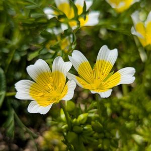 リムナンテス (リムナンテス科リムナンテス属) アメリカ原産 忘れな草をバックにリムナンテスが鮮やかに咲いていました🤍💛 リムナンテスはこんもりとした草姿になり春から秋にかけて株を覆うようにお花をつけます お花は真ん中が黄色でまわりが白色🤍💛 一見ポーチドエッグに似てることから英名でポーチド・エッグ・プランツと呼ばれています 変種に白い縁取りのない純黄色のものもあるそうです 草丈15cm前後 開花時期4~7月上旬の一年草です 花言葉 愉快な気分